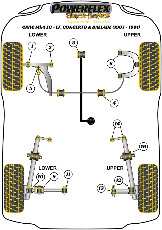 Zewnętrzna tuleja tylnego górnego wahacza Powerflex Black Series Honda Civic Models & Civic Mk4 EC-EE, Concerto & Ballade (1987-1991) PFR42-612BLK