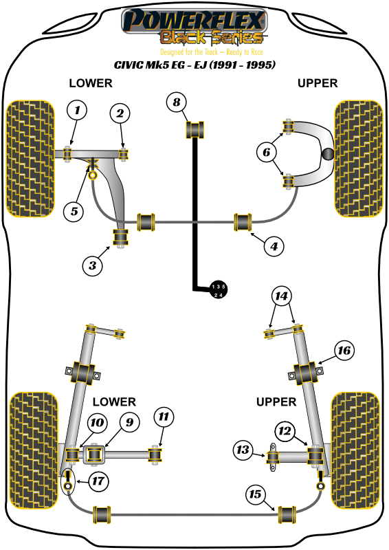 Tuleja Poliuretanowa Powerflex Black Honda Civic EG4/5/6, EJ1/2 (1992 - 1996) CRX Del Sol EG1/2, EH1 & EH6 (1992 - 1998) PFR25-116BLK