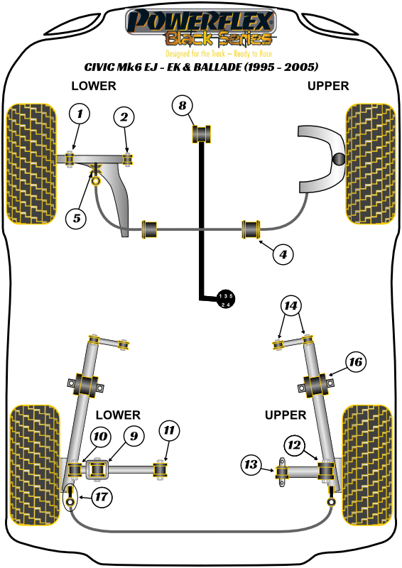 Zewnętrzna tuleja tylnego górnego wahacza Powerflex Black Series Honda Civic Models & Civic Mk6 EJ-EK & Ballade (1995-2005) PFR42-612BLK