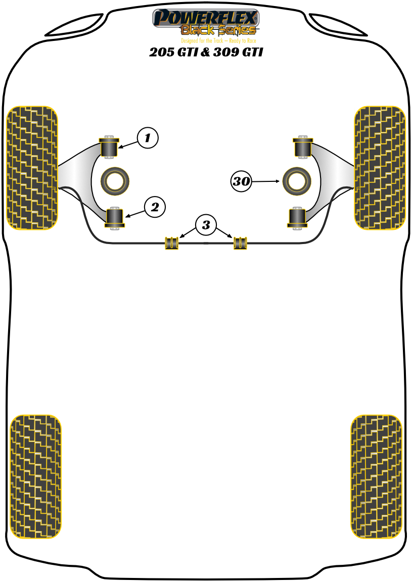 - PFF50-215-17 / PFF50-215-17BLK zastępuje numer części OE: 5094.42 i 509442 montowany w modelach 205 1.6GTI, 205 1.9GTI 205 1.8XDT. Pasuje do 17mm ARB.