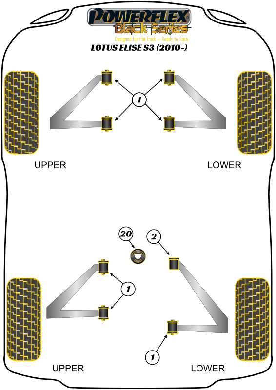 Przednia tuleja dolnego tylnego wahacza trójkątnego Powerflex Black Series Lotus Elise (1996 - 2021) & Series 3 (2010 on) PFR34-1002BLK