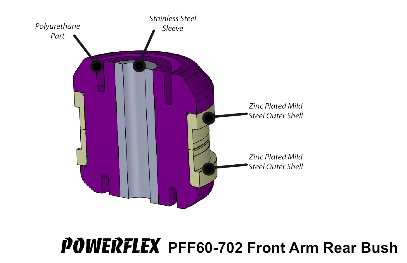 Informacje dodatkowe (Ang): This part fits RS models only with a cast aluminium arm and features two CNC machined steel outer shells to hold the bush securely in place whilst adding area to increase the stiffness of the bush. For a version of this bush that offers caster offset, please use PFF60-702G. In our Road Series purple material, stiffness is increased by over 100% when compared to the original rubber bush.